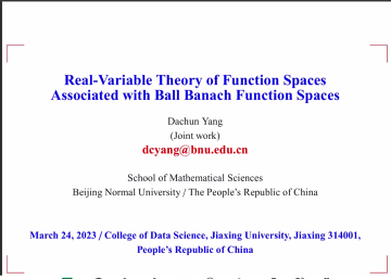2023年3月24日,应万象城娱乐awc线路邀请,北京师范大学杨大春教授教授(博导)来我院进行学术交流。杨大春教授现为北京师范大学博士生导师,二级教授,国务院政府特殊津贴获得者,中共中央统战部联系的党外专家,第八届教育部科学技术委员会数理学部委员和北京师范大学第八届学术委员会委员。杨大春教授主要从事基础数学调和分析特别是函数空间实变理论及其应用方面的工作, 在欧氏空间和度量测度空间等底空间上的各种函数空间实变理论获得了一系列优秀成果,承担多项国家自然科学基金及教育部博士点基金项目。