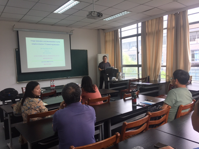 庞博士根据近来的研究经历,以“Image restoration via the local adaptive TV-based regularization”为主题进行交流,重点在如何根据图像纹理构建自适应去噪算法,以及在智慧医疗背景下,算法如何在医疗影像中得到实际应用等问题做了详细介绍。