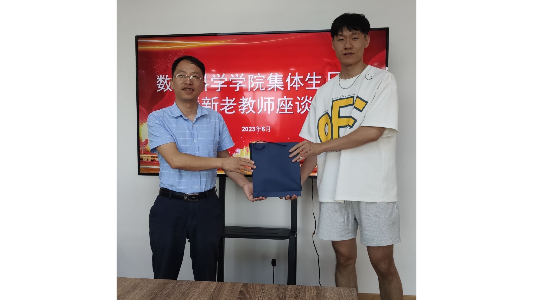 院长张景军代表学院再次感谢各位老师、各位寿星在工作岗位上兢兢业业的付出和奉献,同时他代表学院为新入职教职工送上纪念品。