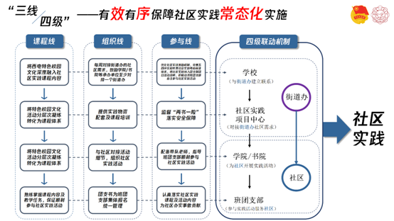 深入社区开展需求调研走访,立足学校内生资源,打造校地共建社区实践基地,形成双向协同的合作机制。建立“三线四级”的社区实践组织架构,按照“课程线-组织线-参与线”的运行机制和“学校-社区实践项目中心-学院书院-班团支部”的联动机制,有效有序保障社区实践常态化实施。按照每周对接社区需求,项目中心提供实践物资配套及课程培训,学院书院组织实践活动配备带队教师,班团支部报名参与统一管理的联动机制,确保社区实践周周有活动、次次有好评、人人有收获。在课程建设方面,着力推动西电特色校园文化活动分层次向课程体系凝练转化,将校园文化特色深度融入社区实践。在组织实施方面,合力推进“一院一品一街道”模式建设,鼓励各学院至少对接一个街道办,定向、长期、稳定开展特色社区实践活动。在学生参与方面,进一步优化社区实践激励机制,完善五四评优和年度社会实践考核标准体系,将社区实践纳入团支部团日活动范畴,积极动员班团支部自主参与社区实践活动,提高学生参与度。同时,强化安全责任意识,明确将“两书一险”(即签署安全责任书、家长知情同意书和购置当天基础保险)设置为实践前置规定动作,为社区实践安全开展提供保障。