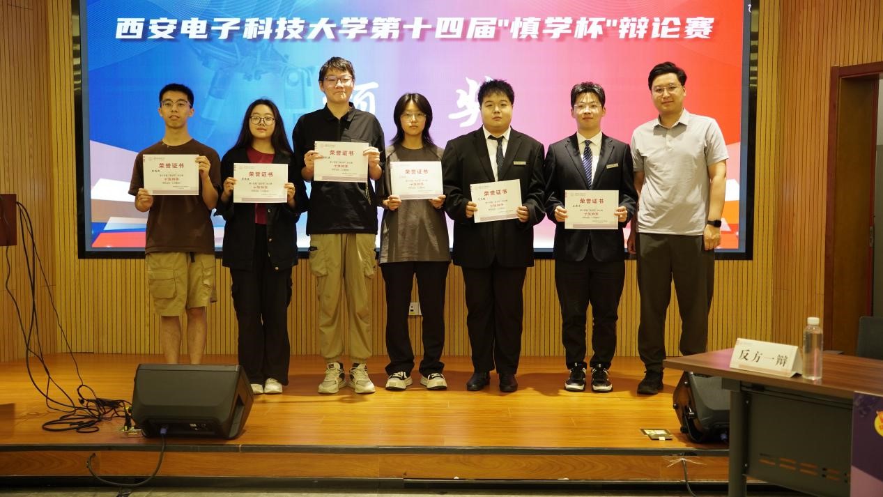 谢宇航老师为本届“慎学杯”辩论赛十佳辩手颁奖,获得本届“慎学杯”十佳辩手的同学有:空间科学与技术学院辩论队王博宇,经济与管理学院辩论队华文韬,电子工程学院辩论队闫瑭琦、孙皓阳,通信工程学院辩论队张泽奇、王炜栋,生命科学与技术学院辩论队胡钊源,人工智能学院辩论队黄柏特、陈轩,集成电路学部辩论队马欣文、叶汪洋、温己仟,外网联队黄梓霖